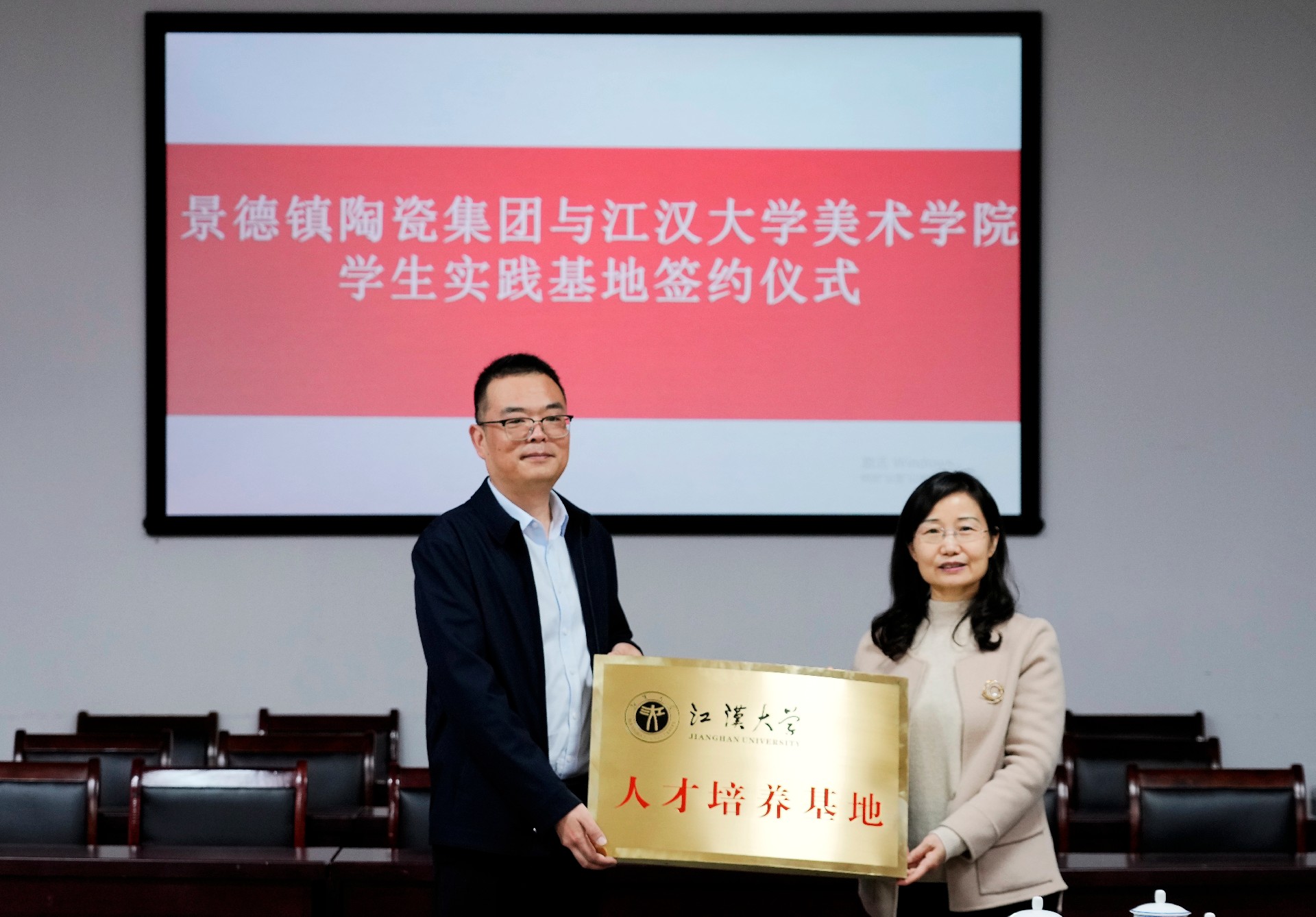 会上,举行了江汉大学美术学院与景陶集团“共建学生实践基地”签约授牌仪式。集团人力资源部部长薛景玉、江汉大学美术学院副院长马杰分别代表双方初步签订了《校外实习基地建设协议书》,江汉大学美术学院副书记杨绪军代表江大美院捐赠《江汉大学美术学院毕业作品集》等书籍。