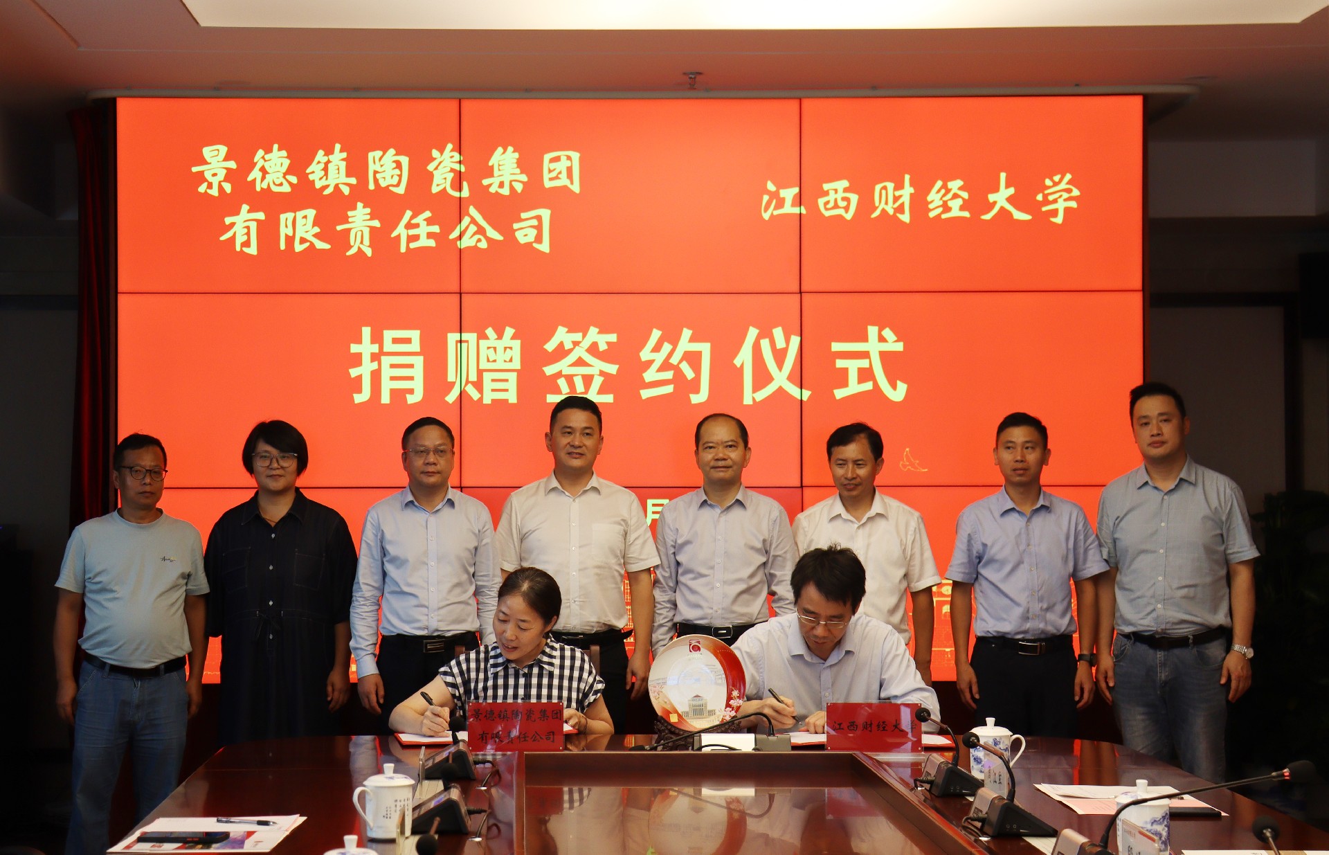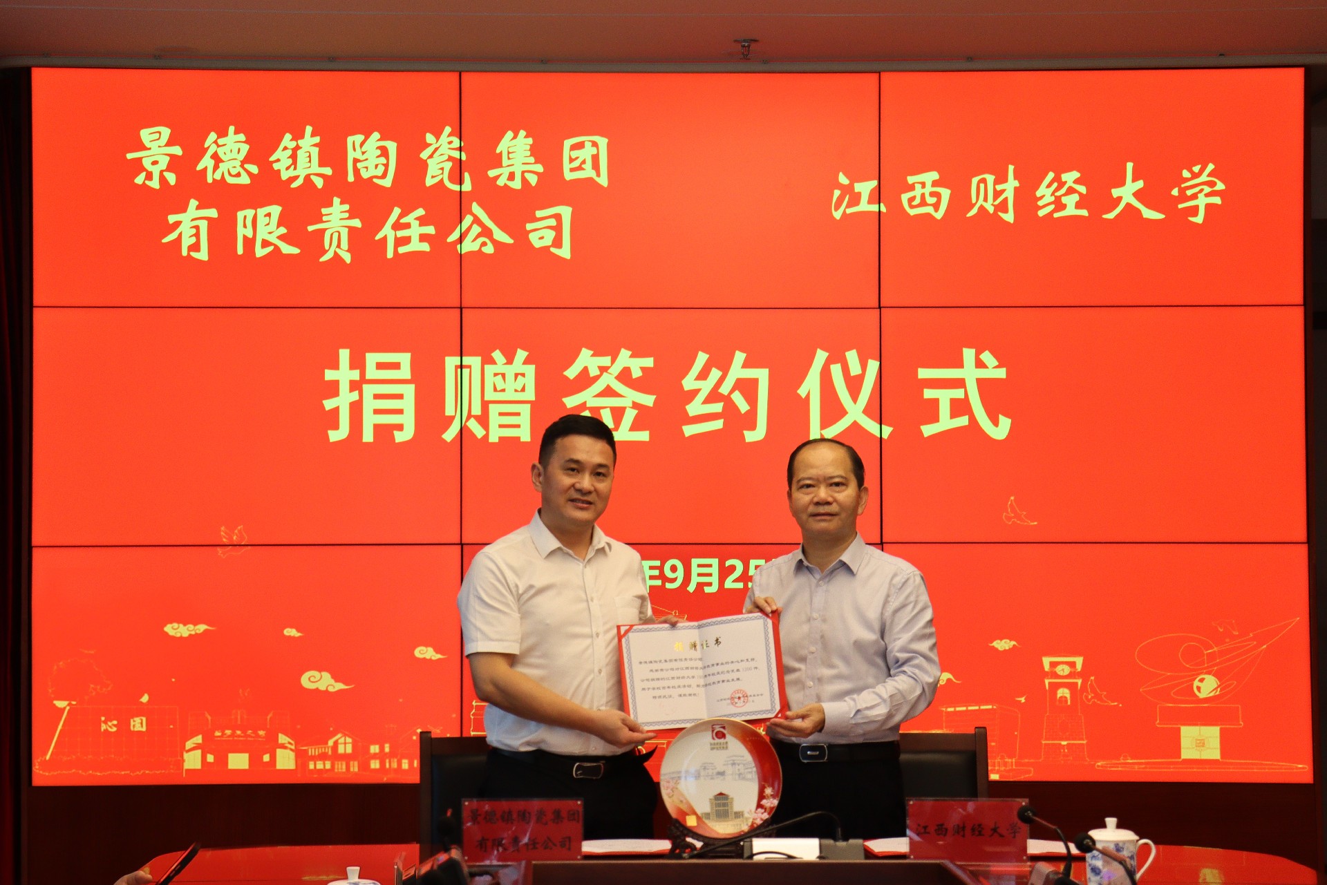 签约仪式上,吴爱云代表景陶集团与江西财经大学签署捐赠协议,并捐赠纪念瓷盘,邓景扬代表景陶集团接受江西财大颁发的《捐赠证书》。