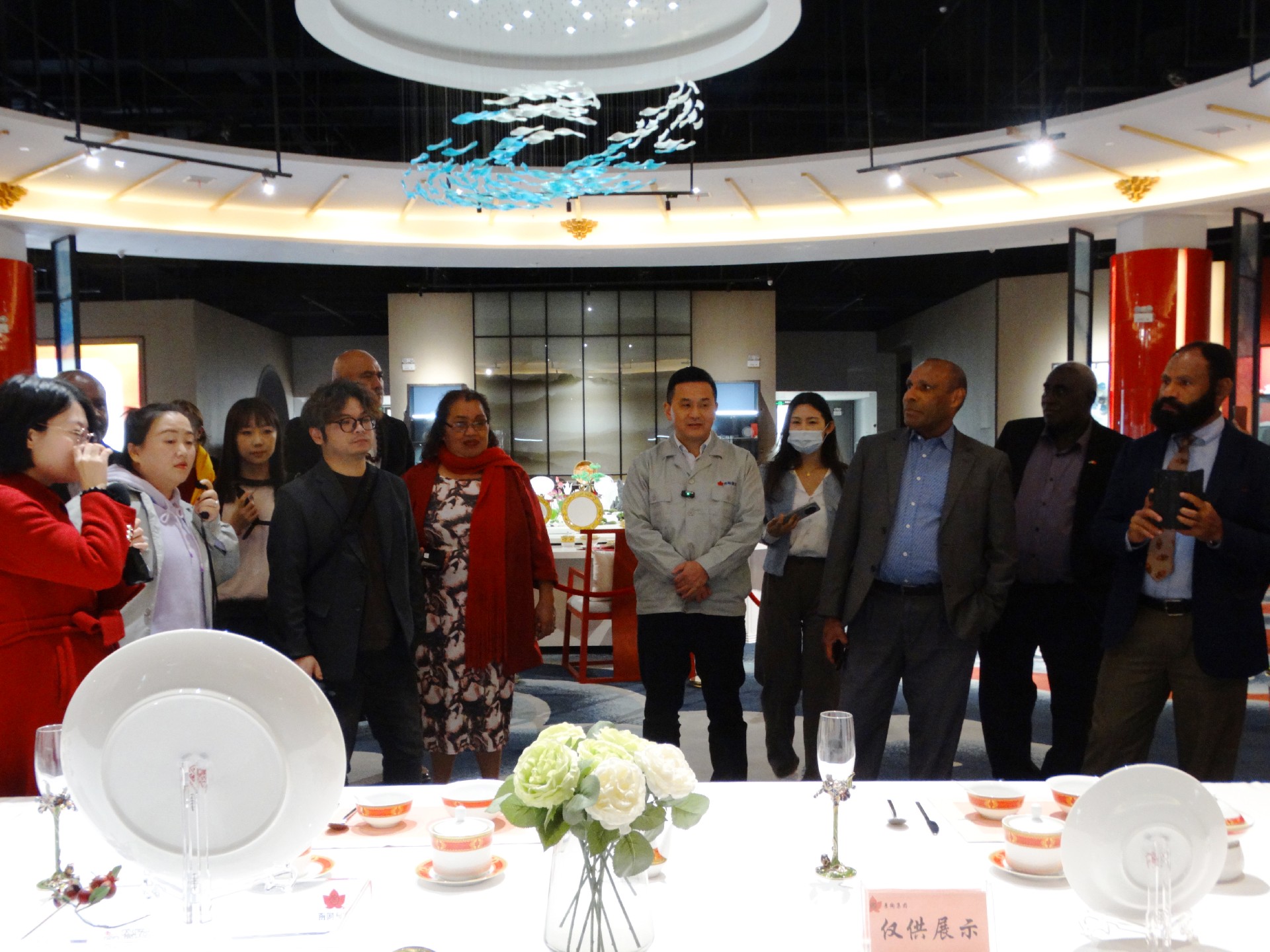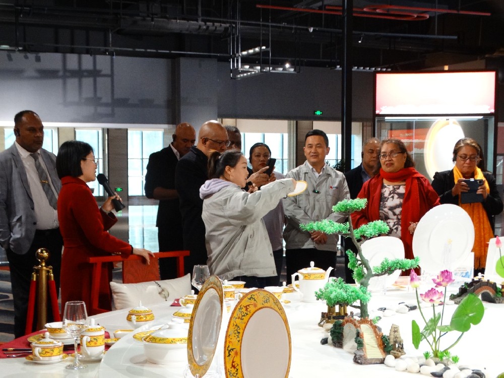 11月24日下午,太平洋岛国议员研讨班一行到景陶集团考察。省人大常委会副主任胡世忠,省人大常委会秘书长、办公厅主任杨文英,省人大常委会外侨民宗工委主任韩军,省人大社会委副主任委员赵慧,省人大常委会办公厅副主任温雪松陪同。景陶集团党委书记、董事长邓景扬陪同接待。