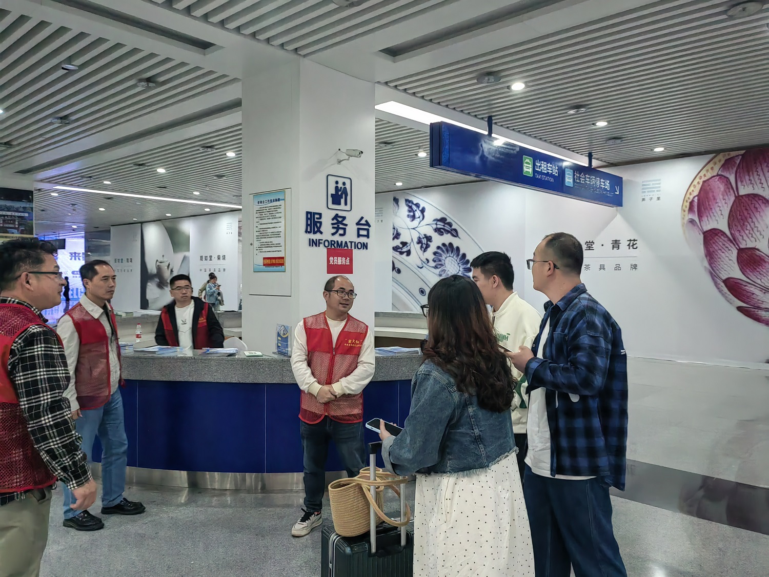 4月30日,五一假期前夕,景陶集团组织70多名党员志愿者参加市“窑火红”党员志愿服务活动。他们身穿红马甲,忙碌穿梭在景德镇北站南广场,北广场和罗家飞机场的旅客中,为来景游客指引路线,提行李,推介美食美景美宿,引导车辆有序停放等,送上热忱暖心的服务,流动的红马甲成为一道靓丽的“风景线"。